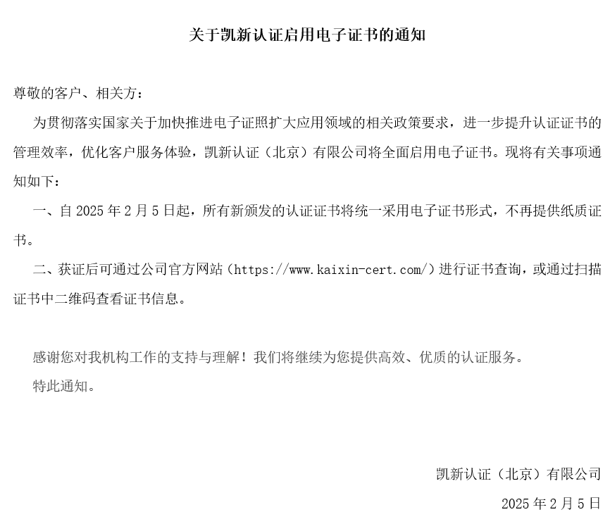 為貫徹落實國家關于加快推進電子證照擴大應用領域的相關政策要求,進一步提升認證證書的管理效率,優化客戶服務體驗,凱新認證(北京)有限公司將全面啟用電子證書。現將有關事項通知如下