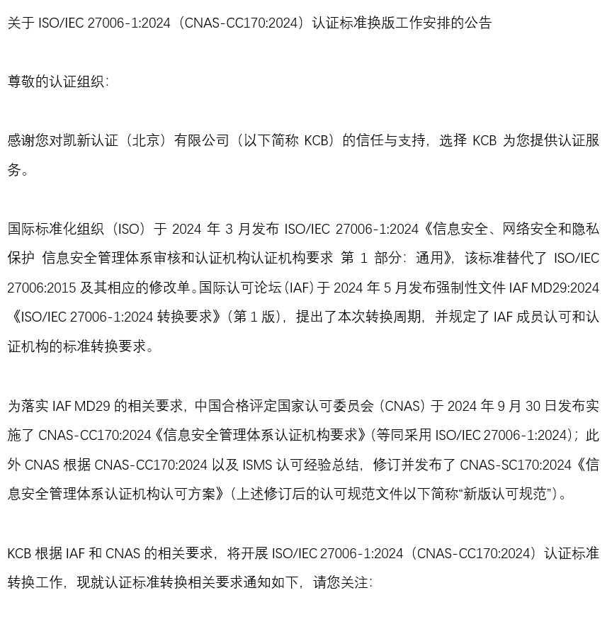關于ISO/IEC 27006-1:2024(CNAS-CC170:2024)認證標準換版工作安排的公告